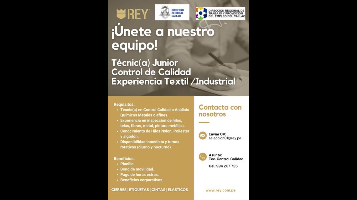 Estamos en busca de 02 Inspector(as) de Control de Calidad Textil que supervise, verifique y documente el cumplimiento de estándares en las diferentes etapas de producción de cremalleras, promoviendo una mejora continua.